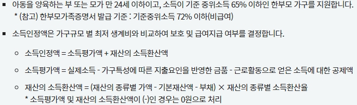 한부모 가정, 특히 만 24세 미만의 어린 엄마 또는 아빠가 자녀를 돌보는 동시에 기준 중위소득의 65% 미만의 소득으로 어려움을 겪고 있는 가정에 도움을 드리기 위해 마련되었습니다.